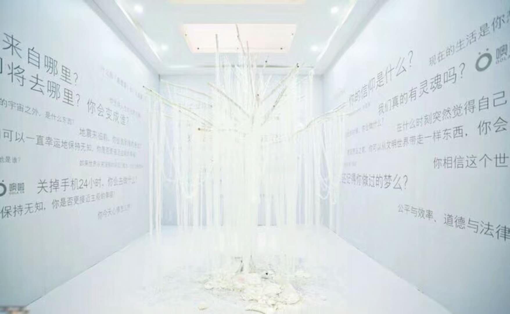 静 「静」馆中央,布置了一棵纯白色的艺术树,宛如到了美术馆,紊乱的思绪渐渐得到了安宁。 四面的墙壁上,印了35个具有思考意义的问题。站在场馆内静静阅读着墙壁上的问题,陷入沉思,迎来了久违的一场思考。