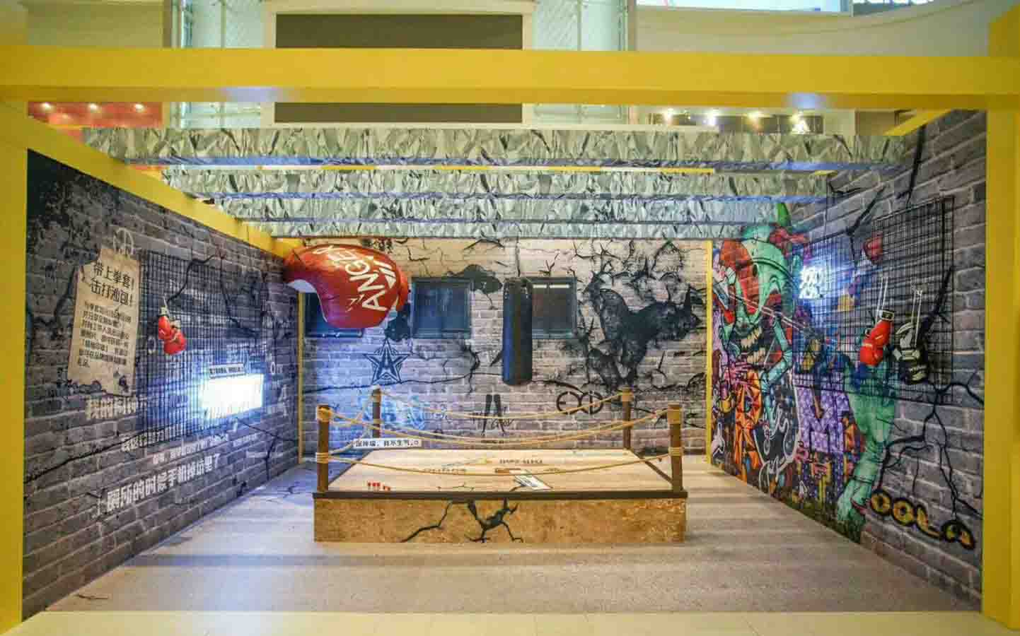 怒 「怒」馆的整体设计以暗灰色调为主,场馆中央搭建了一个擂台,一眼望去就让人很想卸下久埋心中的愤怒。 参与者可以戴上拳击手套,击打沙包,并与沙包进行花式拍照等等。 很多人说,“假笑”是成年人的必修功课,成长就是一个慢慢穿上「微笑保护色」的过程,把自己的真实情绪一言以蔽。戴上拳击手套走上擂台,我们终于可以尽情宣泄了。 「怒」馆的阅读墙上还有很多“假笑时刻”的语录,也有KT板能表达你内心深处的愤怒。