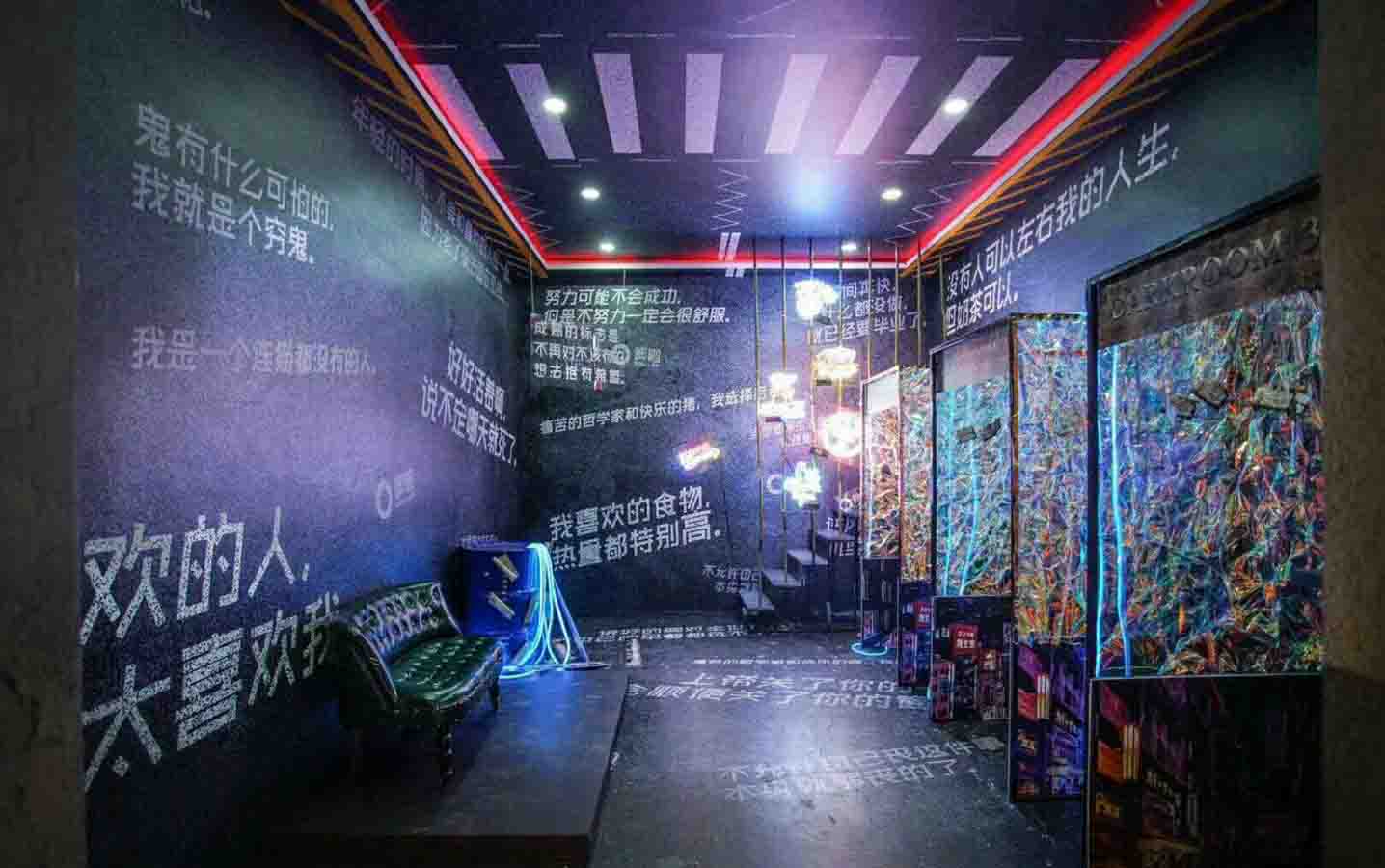 丧 丧气的暗房,还没走进馆内阴郁感就迎面扑来。 “我喜欢的人都不太喜欢我。”“鬼有什么可怕,我就是个穷鬼。”墙壁上满满的都是丧气的话。 除此以外,丧馆里还设了三间“丧气暗房”。独立的空间,给予安全感,令人能放心地卸下丧气。
